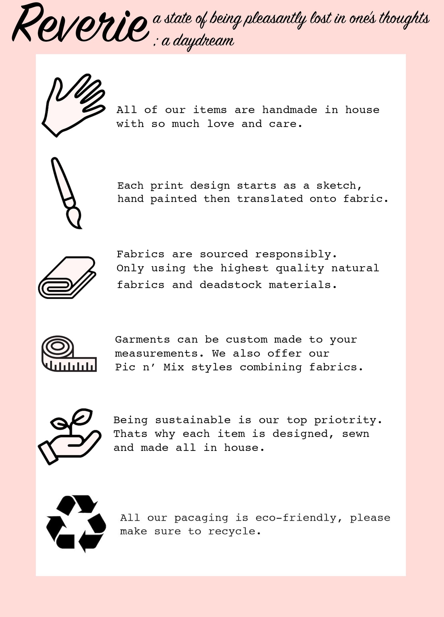 Reverie by Alexandra is a clothing and accessories brand focusing on creating unique products stemming from a love of art and fashion. Each design is handmade in house from start to finish using natural and sustainably sourced materials.