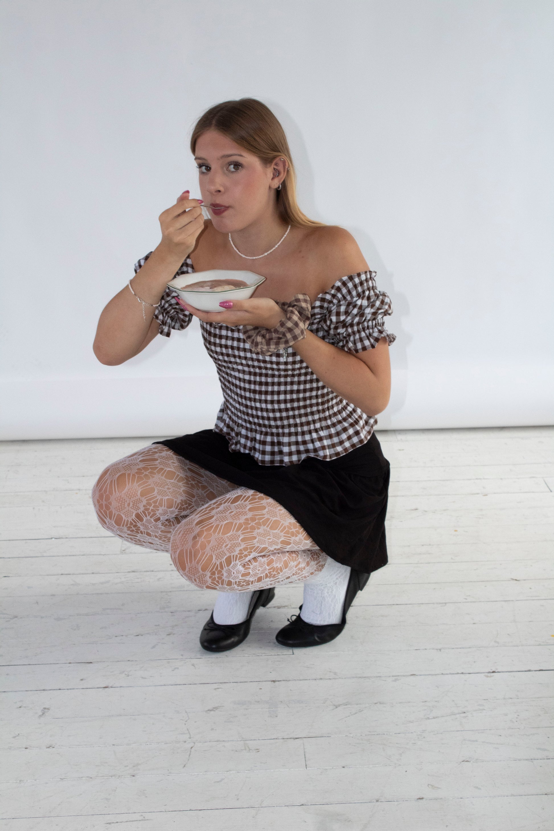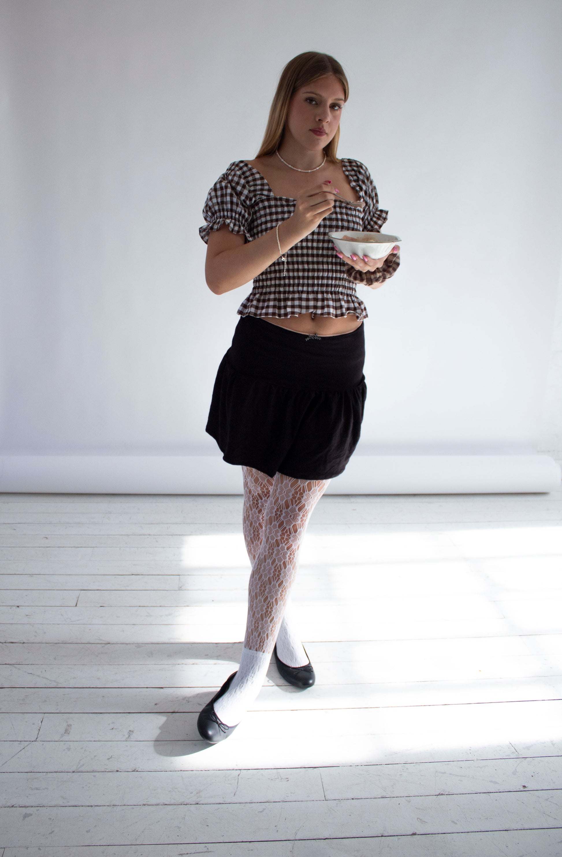 The Bella top in a gingham cotton fabric. Features puff sleeves and a smocked/shirred bodice. Can be worn on or off shoulder!