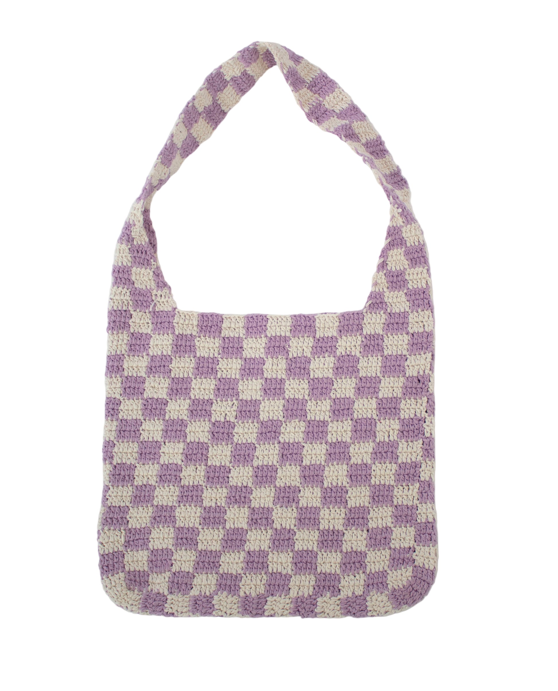 Hand crochet chequered lilac and cream bag, 100% cotton yarn.