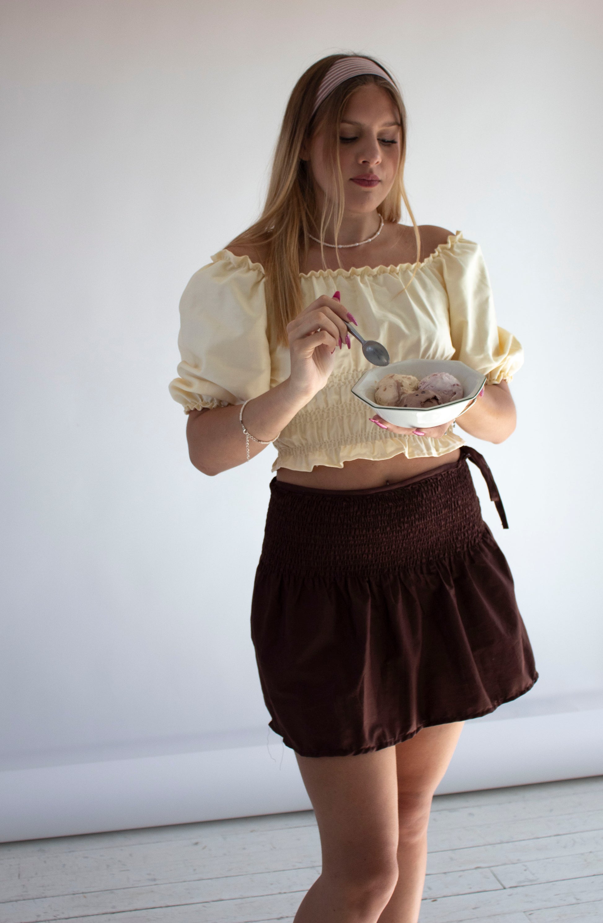 The Celestia top in a beautiful cream/yellow crisp cotton sateen fabric. Features puff sleeves and a smocked/shirred detailing.