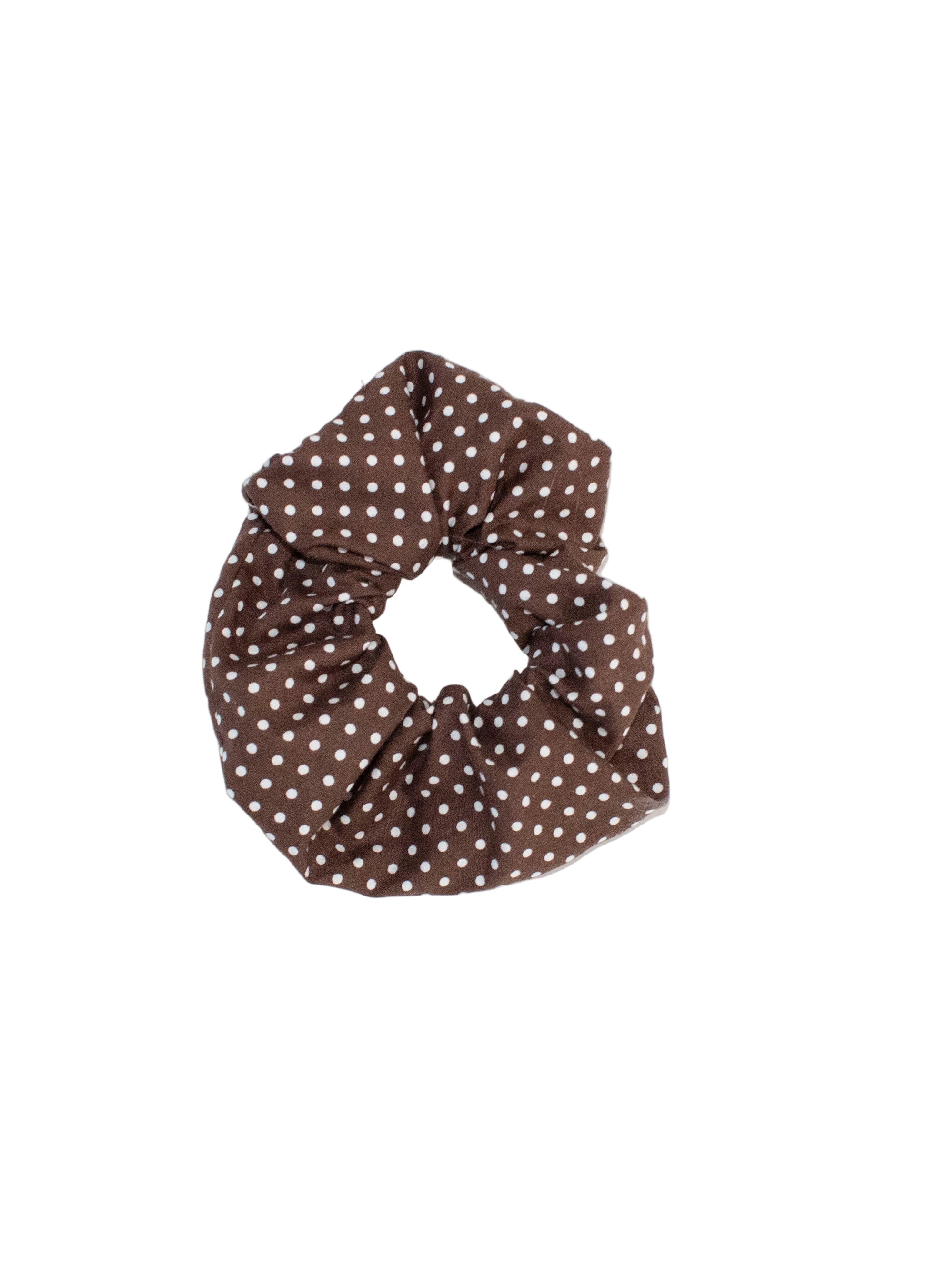 Brown polka dot handmade scrunchie, made with 100% cotton. Pair with our Rosaline skirt!
