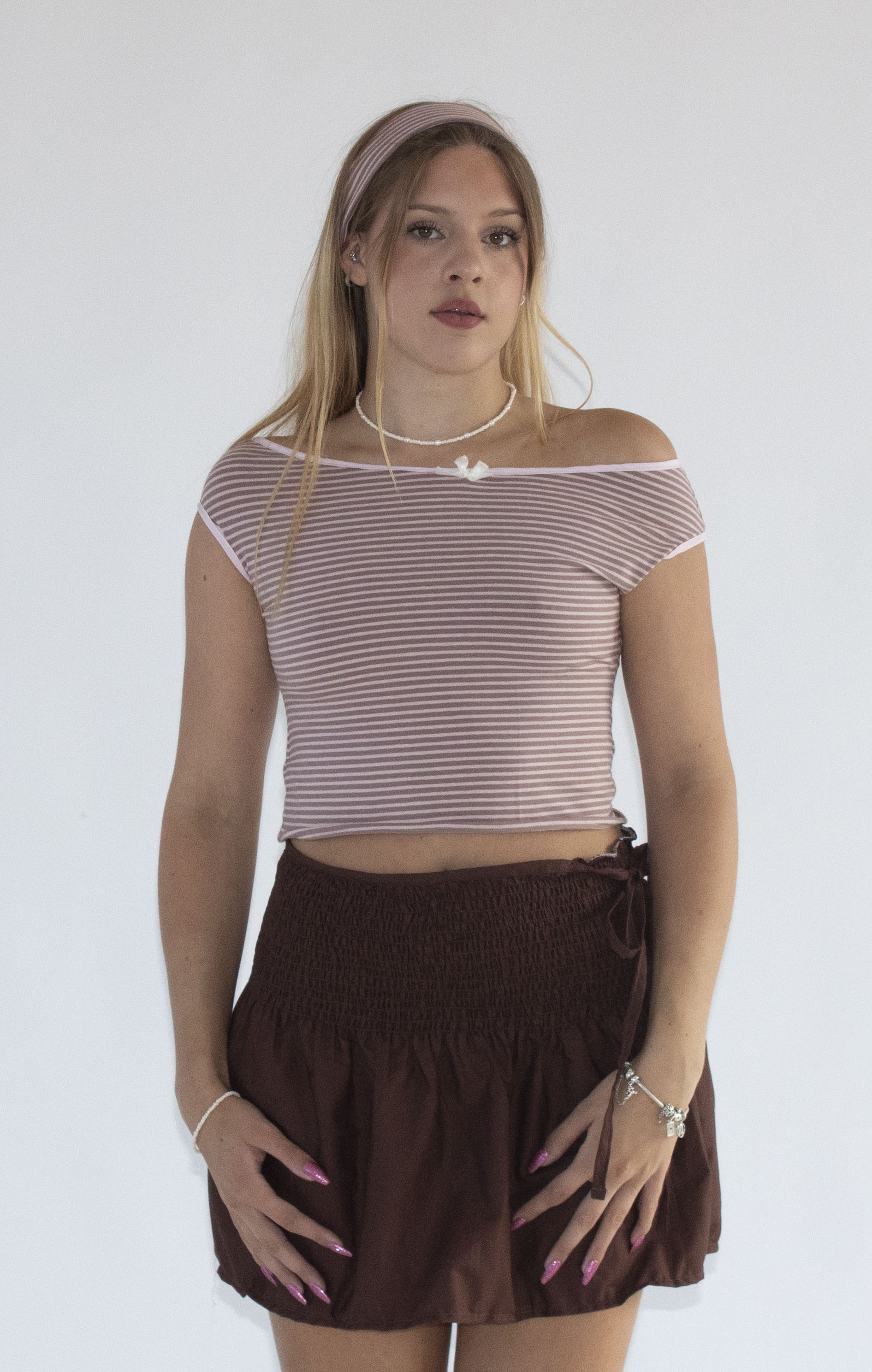 The Rosa skirt in a luxurious brown cotton fabric, flattering smocked waist with a tie bow detail.
