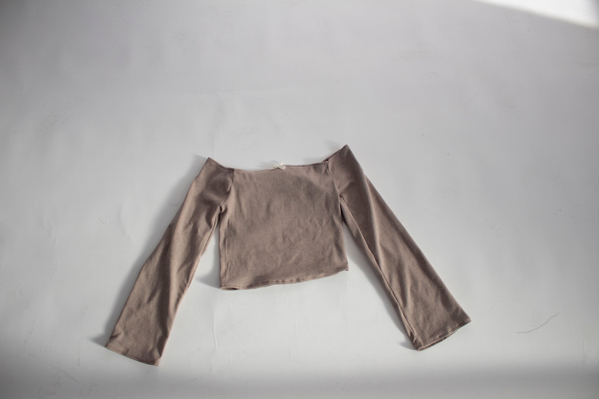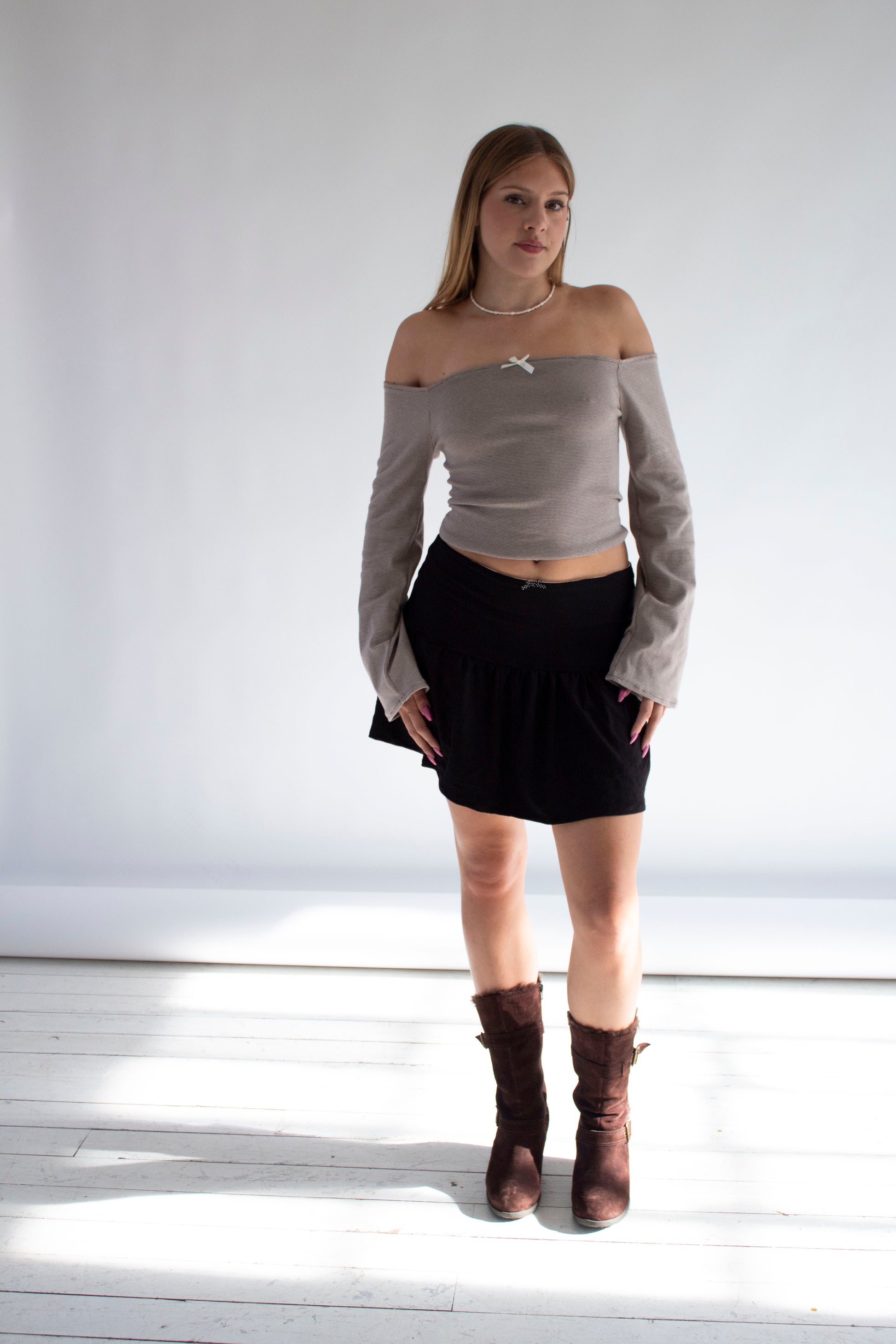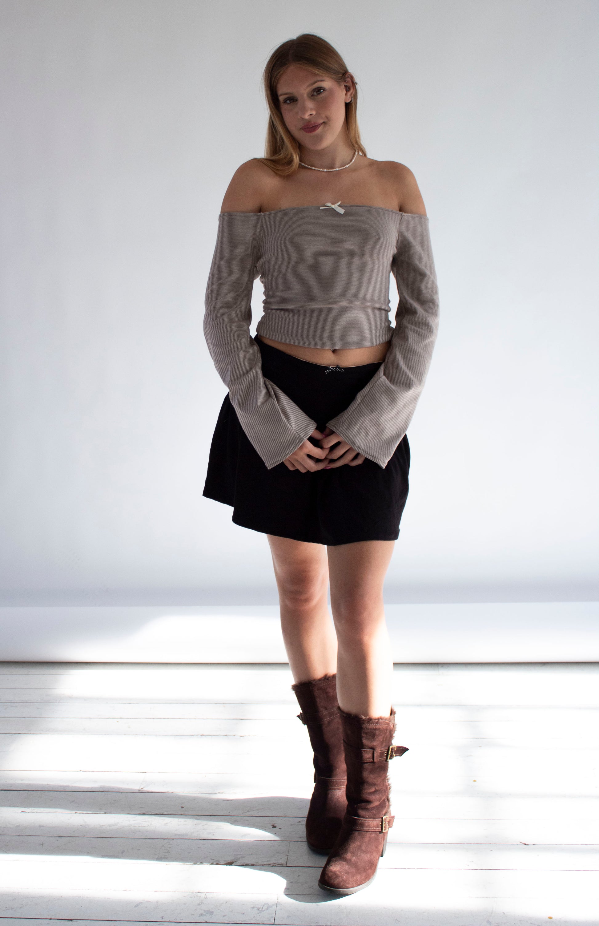 The Stella top in a super soft ribbed striped fabric. A chic, off the shoulder top with a cute bow, perfect for styling with our Willow skirt.