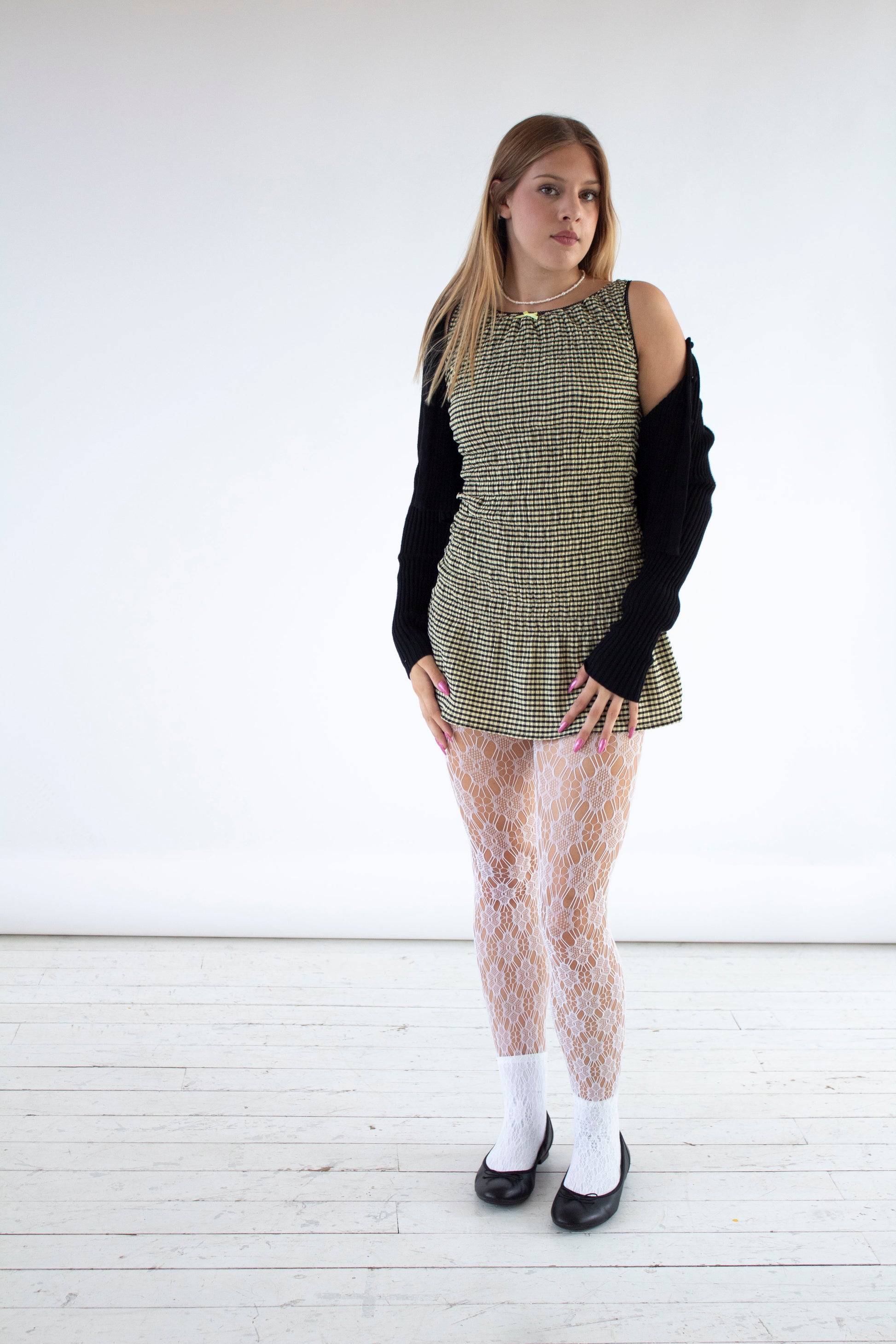 Yellow and black gingham smocked A-line dress with a black picot trim and yellow bow, perfect for layering!
