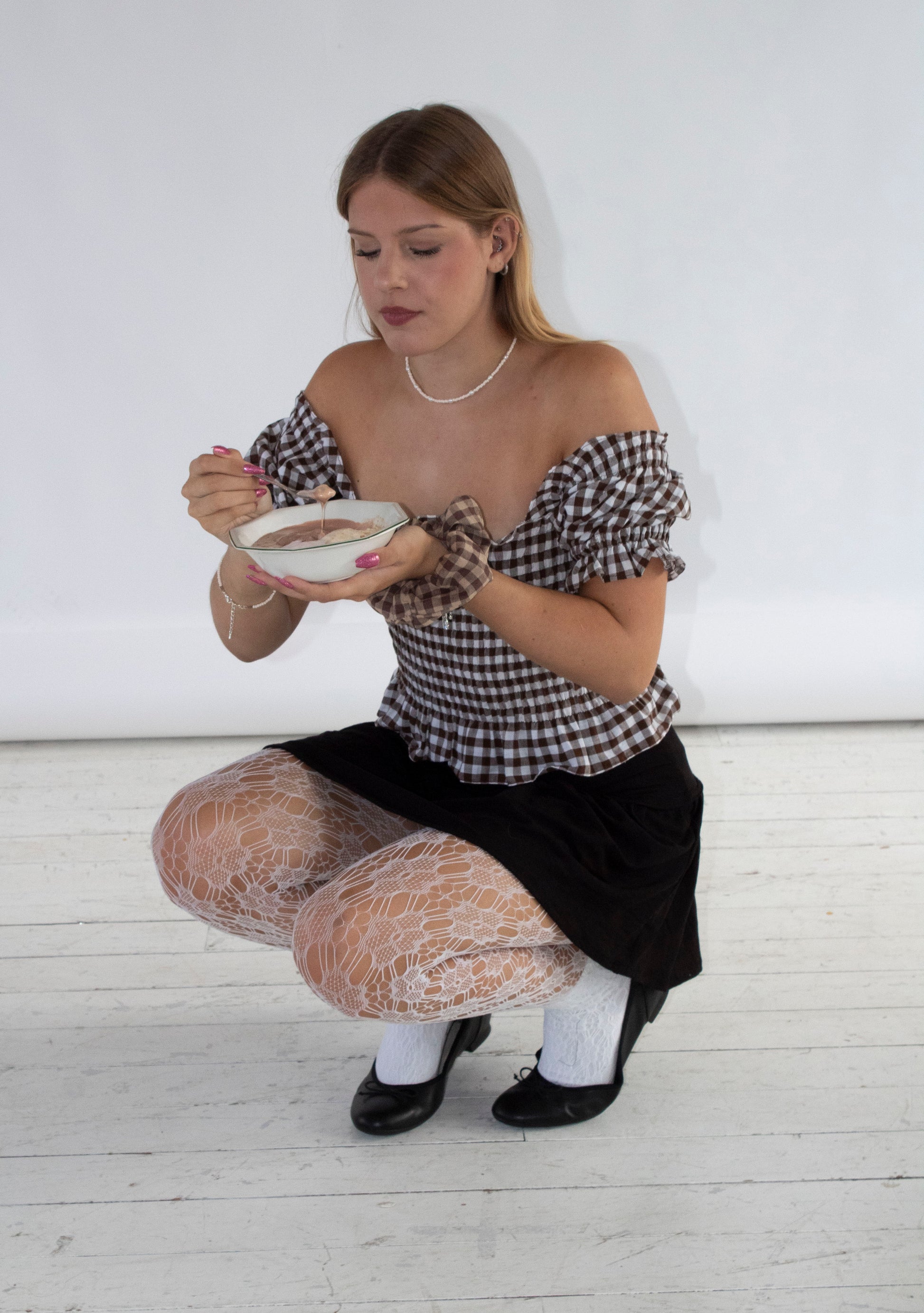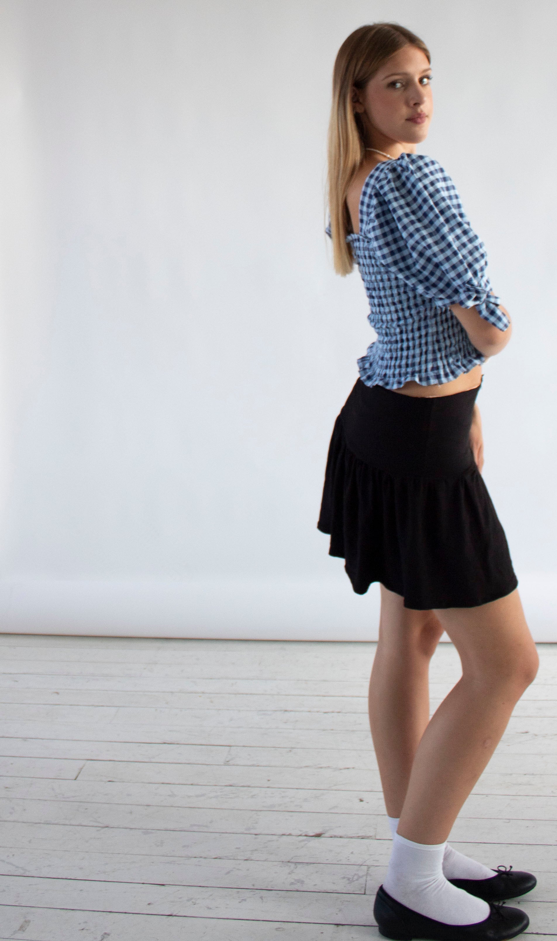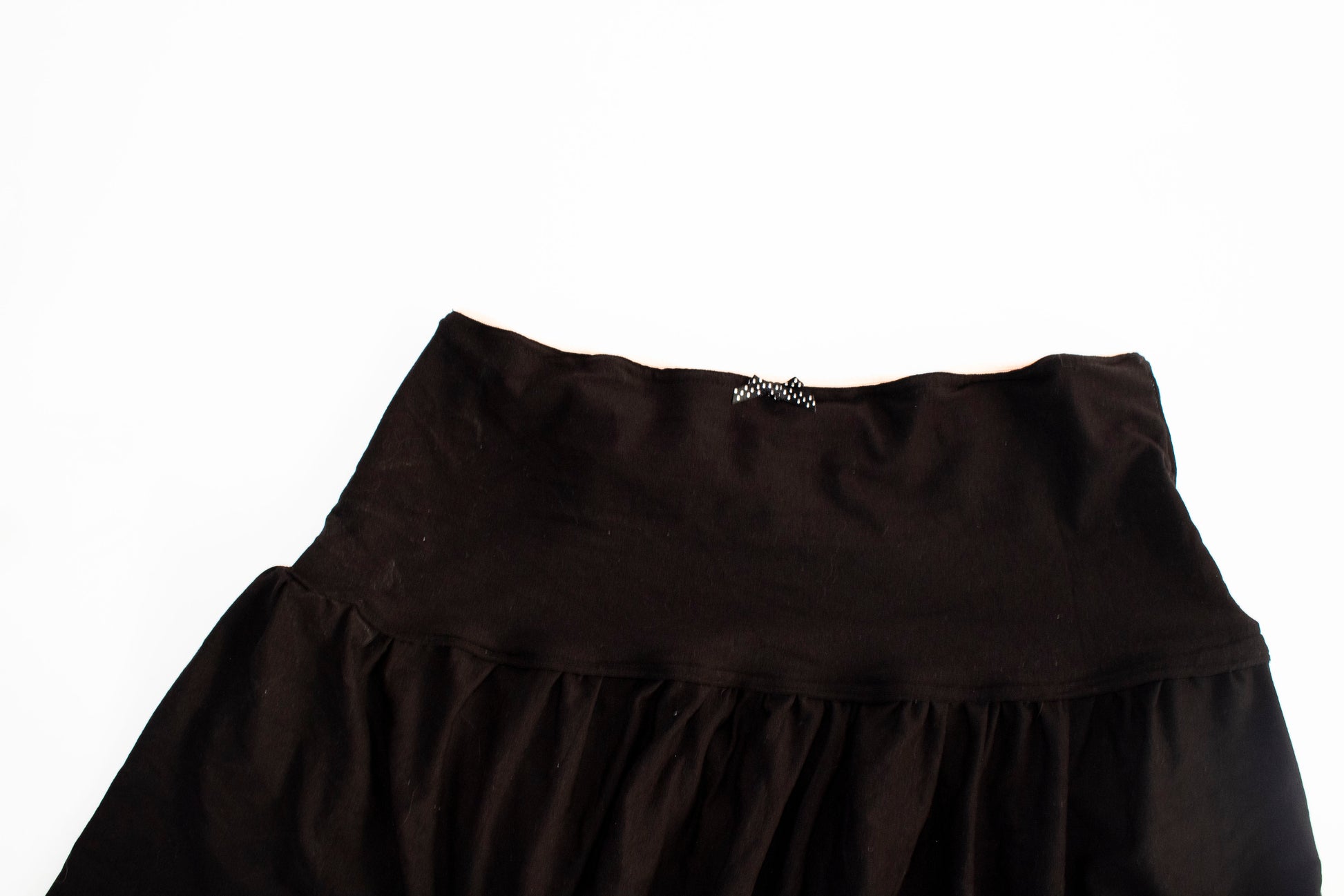 The Willow skirt in a super soft and stretchy black jersey with a cute pink picot trim and polka dot bow, perfect for styling with our tops!